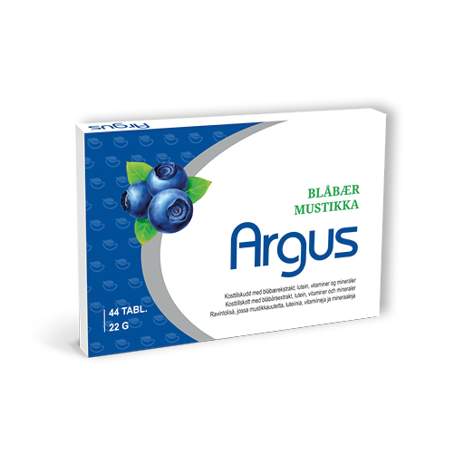 Argus innehåller antocyanider från blåbärsextrakt, lutein från stort sammetsblomster, vitamin A, E och zink.