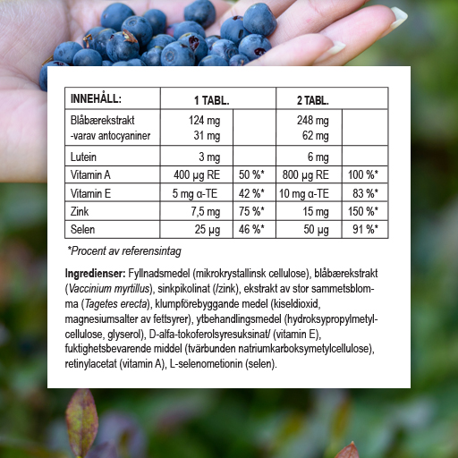 AntocyanociderAntioxidant antocyanosider från blåbär som hjälper till att bibehålla korrekt näthinnefunktion. En Arbustablett innehåller samma mängd antocyanosider som en handfull färska blåbär (20-40 bär – beroende på storlek).